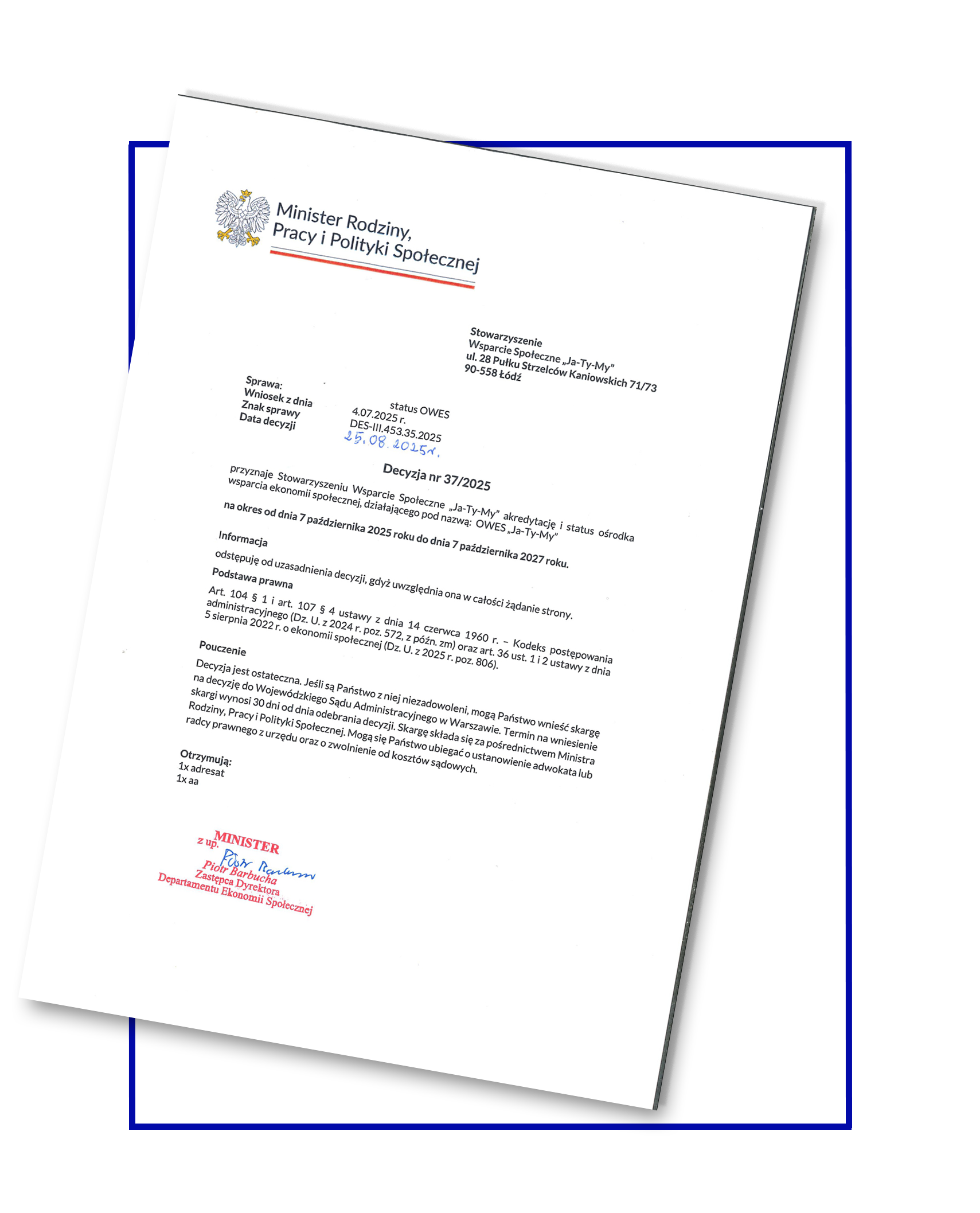 Stowarzyszenie Wsparcie Społeczne „Ja-Ty-My” od 2016 roku jest akredytowanym Ośrodkiem Wsparcia Ekonomii Społecznej. W ramach jego działań realizowane są projekty: Łódzki Ośrodek Wsparcia Ekonomii Społecznej i OWES „Ja-Ty-My”.